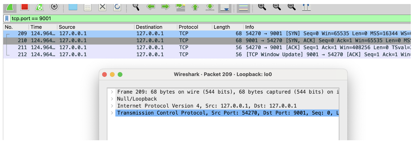 위와 같이 연결 했을때, wireshark에 SYN ACK를 보내 TCP 연결을 확인한다