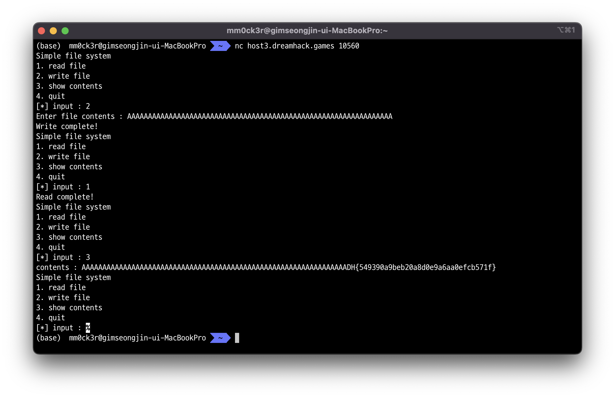 cpp이다. 그냥 readbuffer에 NULL 문자 없이 쫙 덮어버리면 show_contents 함수에서 flag까지 출력하지 않을까?