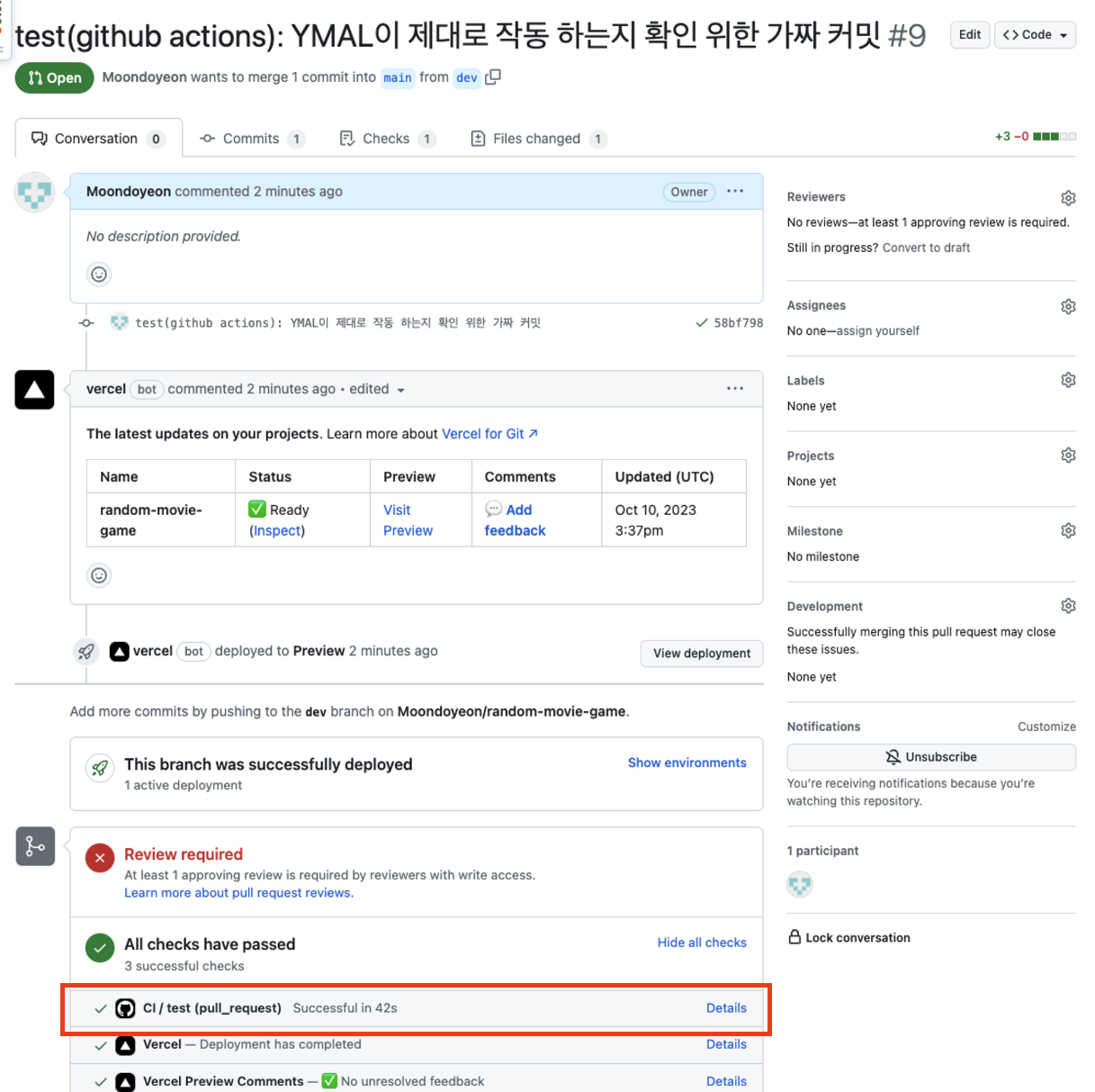 가짜 커밋을 푸쉬, main에 PR 생성했다. 아래와 같이 YAML 파일이 정상적으로 동작하고, 테스트도 통과가 잘됐다.
