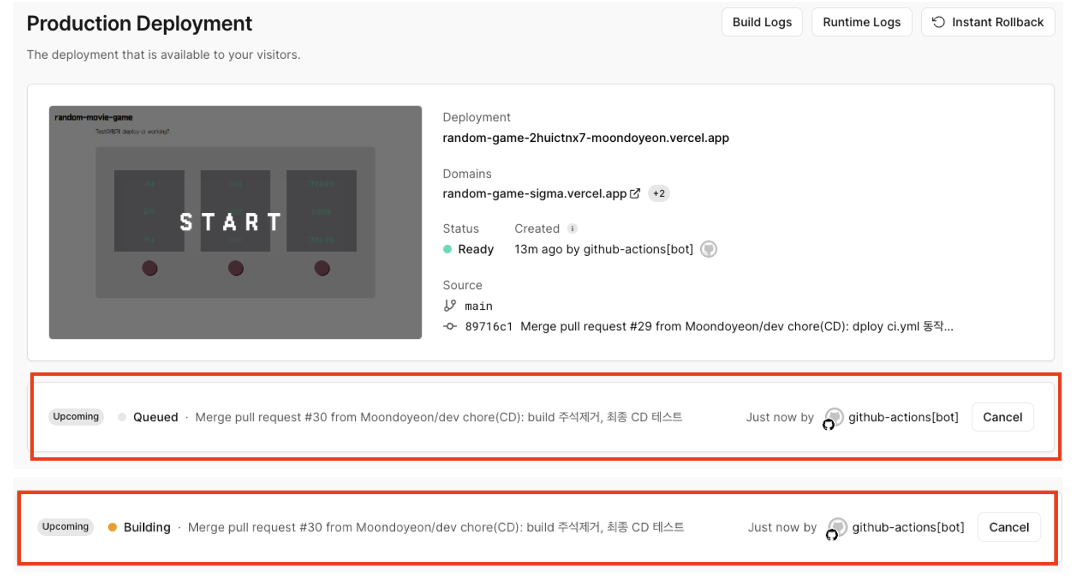 아래 사진에서 빨강네모는 배포가 먼저 이뤄진 것을 보여주고, 파랑네모는 github action 의 CI.YAML이 build job 을 진행중임을 보여준다. 즉, 순서가 안맞는다.