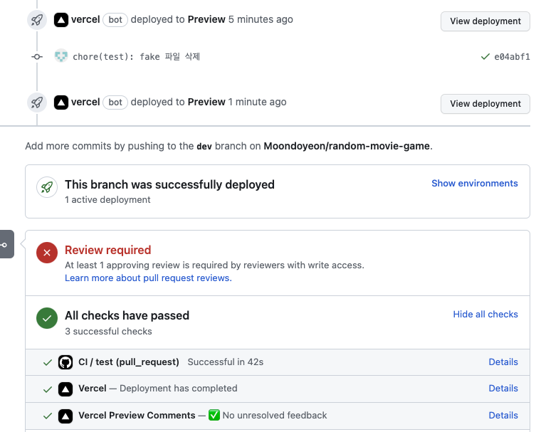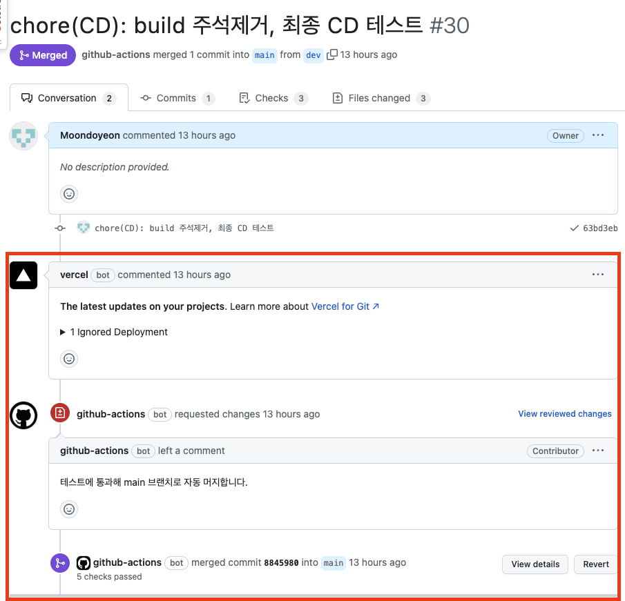 PR을 그대로 둔채, 만들었던 가짜 컴포넌트를 제거하고 다시 커밋, 푸쉬 했다. 다시 YAML 파일이 동작했다.