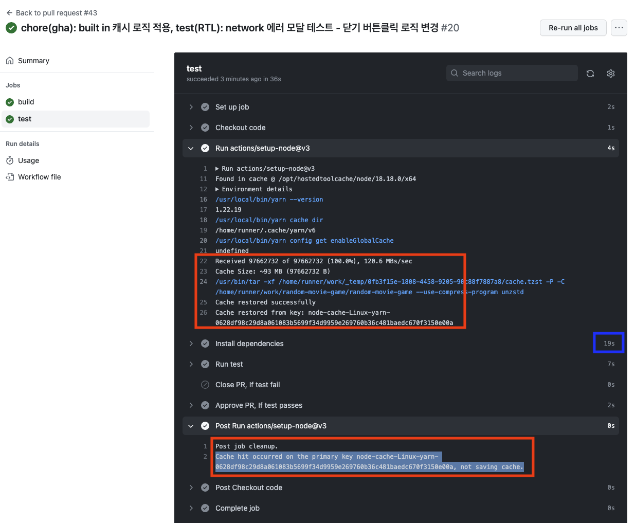 아래사진을 통해 test job에서 캐시 hit하고 의존성 설치에 19초가 소요됨을 알 수 있다. (build job은 의존성 설치에 32초정도 소요됨)