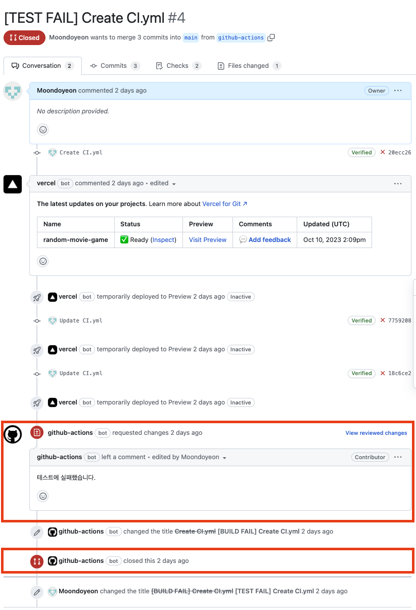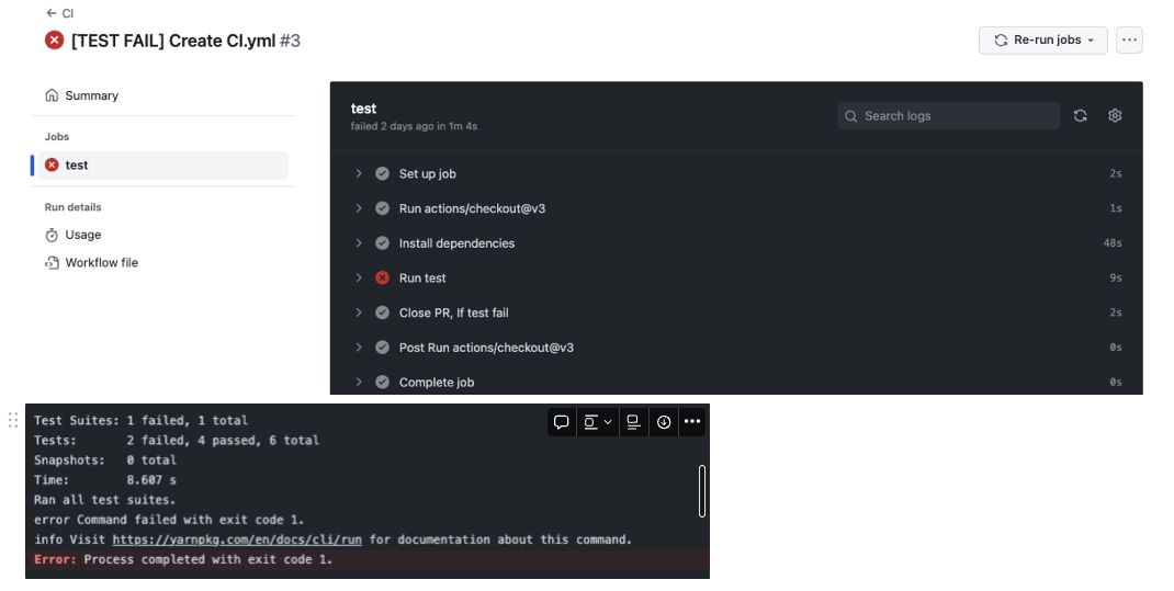 3-2. 빌드 또는 테스트에 실패하면 어떤 단계에서 실패한건지 코멘트가 달리고, PR Close