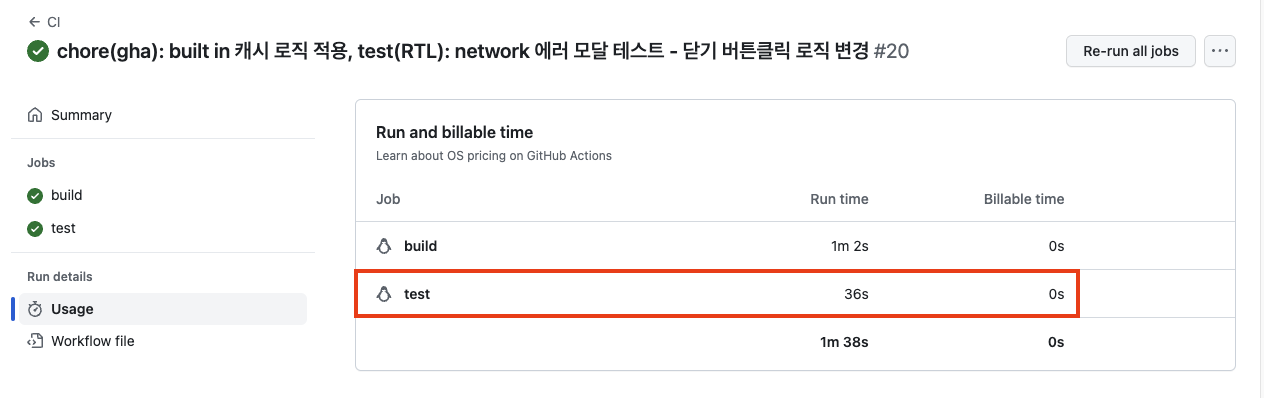캐싱 로직을 적용하기전에 test job의 기존 러닝타임은 55초였고, 캐싱 힛트로 인해 36초로 19초가 단축됐다. 전체 러닝타임은 캐싱적용전 1분49초, 후가 1분 38초이다.