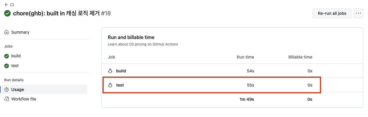 - 캐싱 적용되지않은 test job 소요 시간: 55초