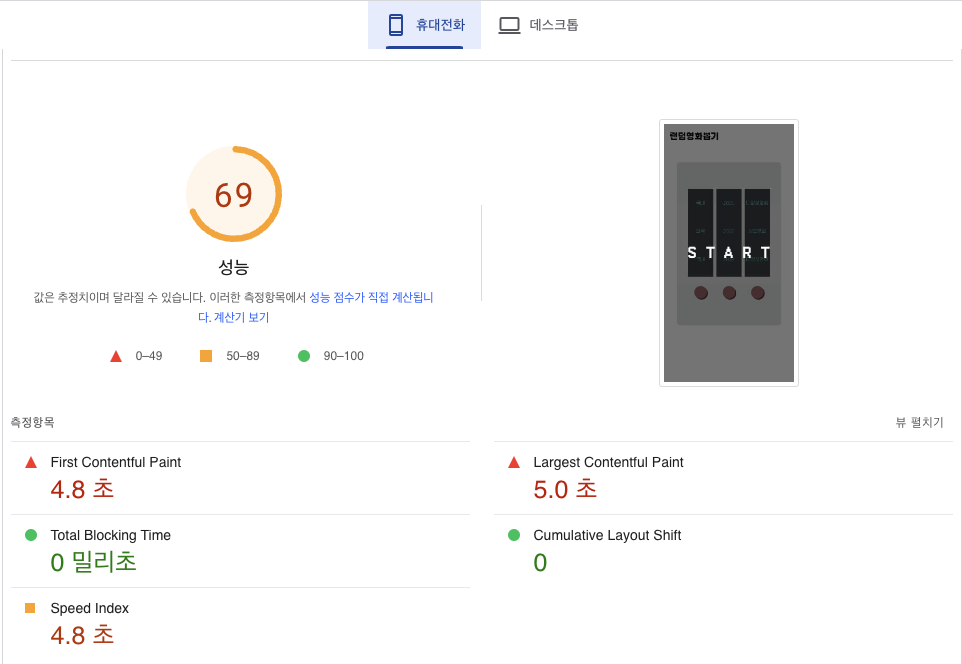 데스크탑은 성능점수가 96점이지만, 모바일은 69점이 나왔다.(2023.10.23. 11:36:02)