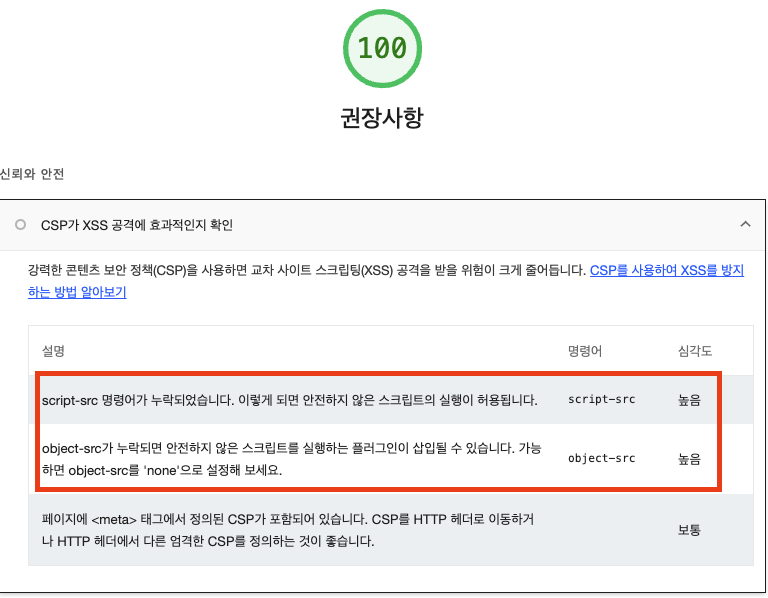 라이트하우스 분석결과, CSP(content security policy)헤더로 브라우저에 대한 XSS 공격 및 데이터 삽입 공격을 포함한 특정 공격을 방어할 수 있다고 한다.