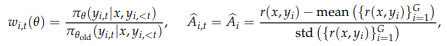 - 토큰에 대한 중요도 비율(Importance ratio), 이점(Advantage)은 아래와 같이 계산