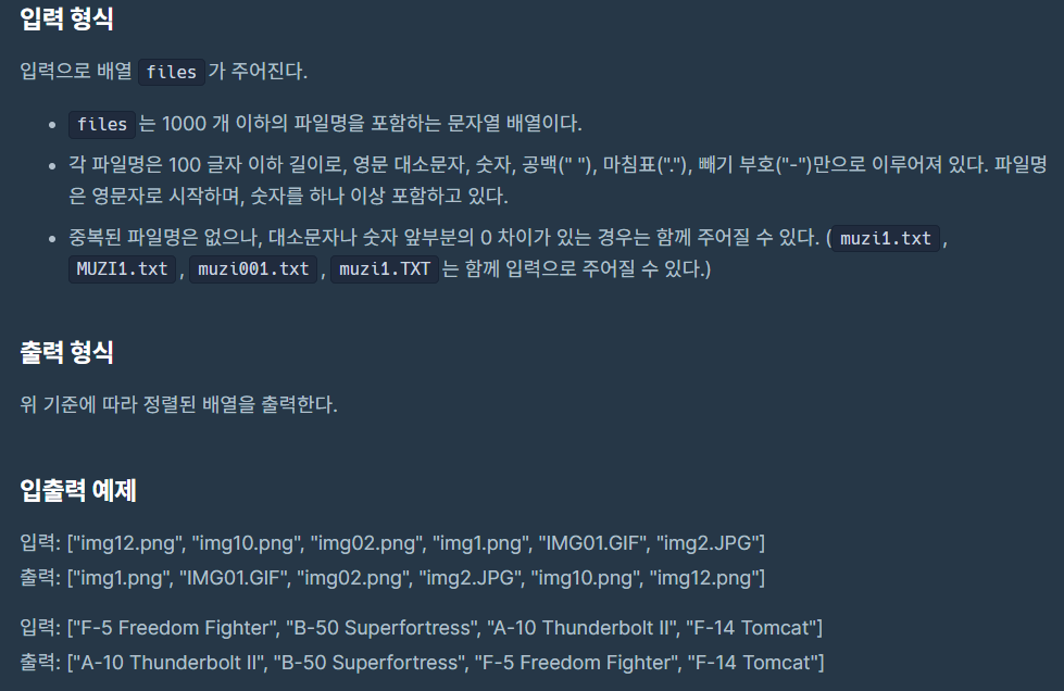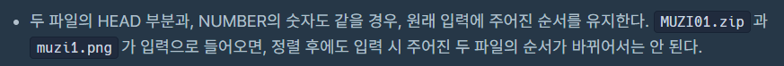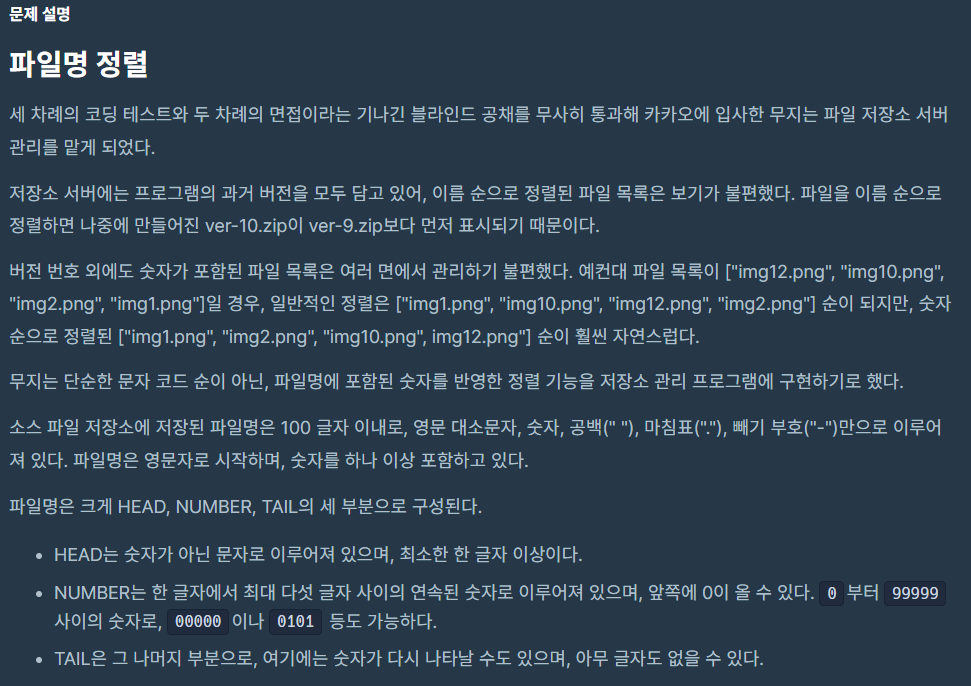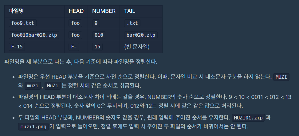 #include <bits/stdc++.h> using namespace std; string convert(string str) { string ret = ""; for(auto c: str) { if(c >= 'A' && c <= 'Z') { c += 'a' - 'A'; } ret += c; } return ret; } vector<string> split(string str) { string head = ""; string numStr = ""; string tail = ""; int headIdx, numIdx, tailIdx; for(headIdx = 0; headIdx<str.size(); headIdx++) { char now = str[headIdx]; if(now < '0' || now > '9') { head += now; } else break; } for(numIdx = headIdx; numIdx<str.size(); numIdx++) { char now = str[numIdx]; if(now >= '0' && now <= '9' && numStr.size() < 5) { numStr += now; } else break; } tailIdx = numIdx; if(tailIdx < str.size()) tail = str.substr(tailIdx); return {convert(head), numStr, tail}; } vector<string> solution(vector<string> files) { stable_sort(files.begin(), files.end(), [](const string& left, const string& right){ vector<string> l = split(left); vector<string> r = split(right); if(l[0] != r[0]) return l[0] < r[0]; else return stoi(l[1]) < stoi(r[1]); }); return files; }