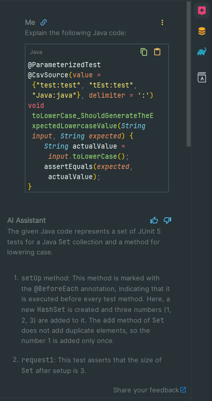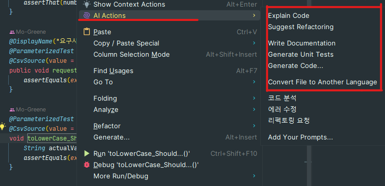 코드 분석 요청, 리펙토링 요청, 주석작성, unit test 요청 등 메서드, 변수 등을 우클릭 후 Ai Actions를 통해 나오는 프롬포트 들을 클릭 후 사용하면된다.