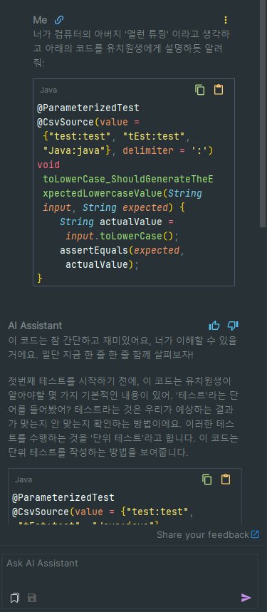 단, 아쉬운 점은 사진에서와 같이 기본 Ai Assistant에서 제공하는 Explain Code를 클릭했을 때