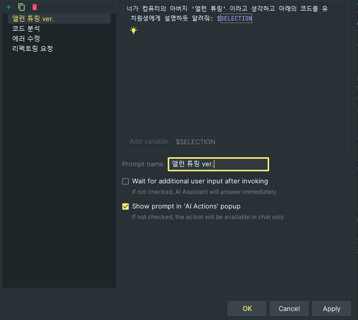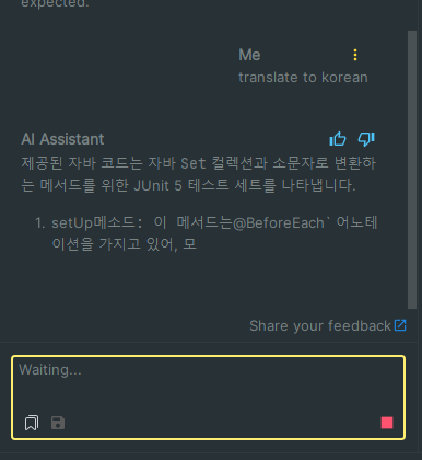 하지만 Ai Assistant의 하나 아쉬운점은 기본이 영어로 되어있다보니 한글로 답변을 받기가 까다로운 점인데