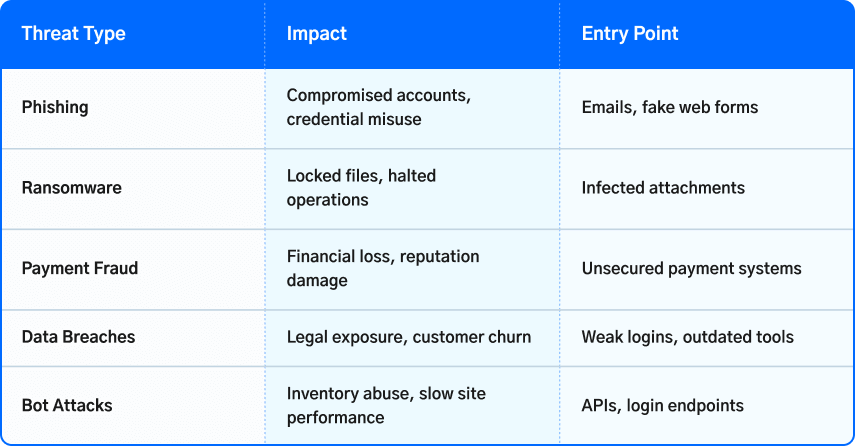 As reach expands, so does the surface exposed to risk. A forgotten software patch or a weak login can create openings that no one expects. In today’s threat landscape, cybersecurity for e-commerce is crucial, as digital threats like ransomware and phishing, bot attacks, and other cyber threats in e-commerce have moved from rare events to routine challenges.