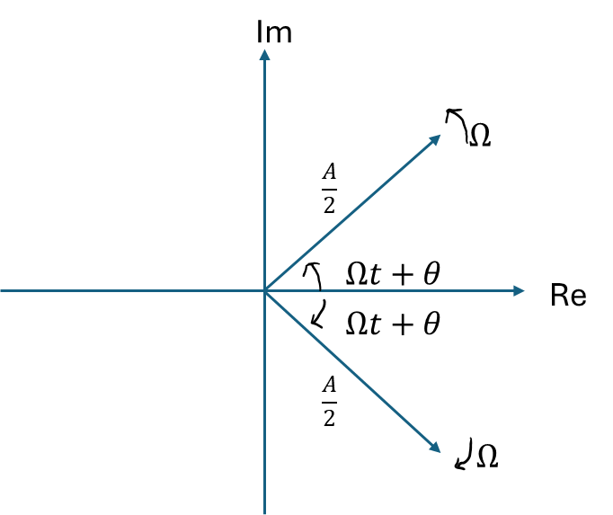 즉 Cos함수는 진폭 의 절반의 크기를 가지고 각주파수가 인 벡터와 진폭 의 절반의 크기를 가지고 각주파수가 인 벡터로 표현이 가능하다.