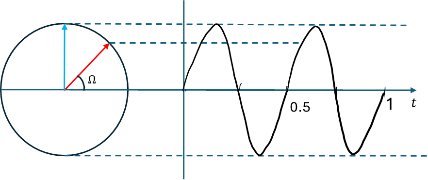 만약 가 라고 가정해보자 이 뜻은 왼쪽 원에서 화살표가 1초에 라디안 (720도) 를 회전한다는 의미이다. [그림 2]의 오른쪽 정현파 함수를 보면 사인 함수의 파형의 주기는 0.5초이고 주파수는 2Hz 임을 확인 할 수 있다.