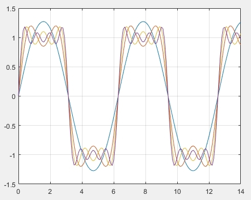 [그림 1]에서는 사각 파형을 만들기 위해 수많은 정현파 신호를 더했다. 기본 주파수의 정현파 함수를 기반으로 Harmonically 관계에 있는 정현파 신호를 모두 더하여 원하는 신호를 만드는 것이다.