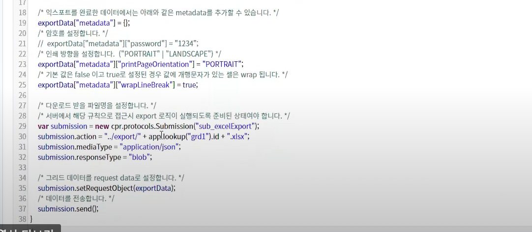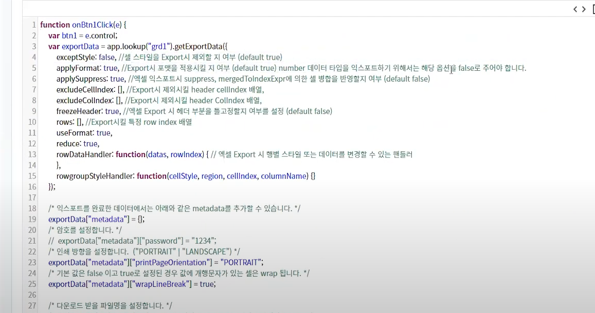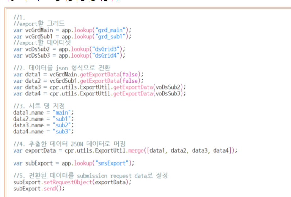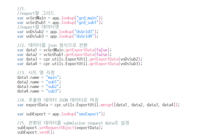 다만, cpr.utils.ExportUtil.getExportData()의 파라메터의 경우 control과 exportOption을 받고 있는데, 이 중 exportOption은 json형태의 param값만 지원합니다.