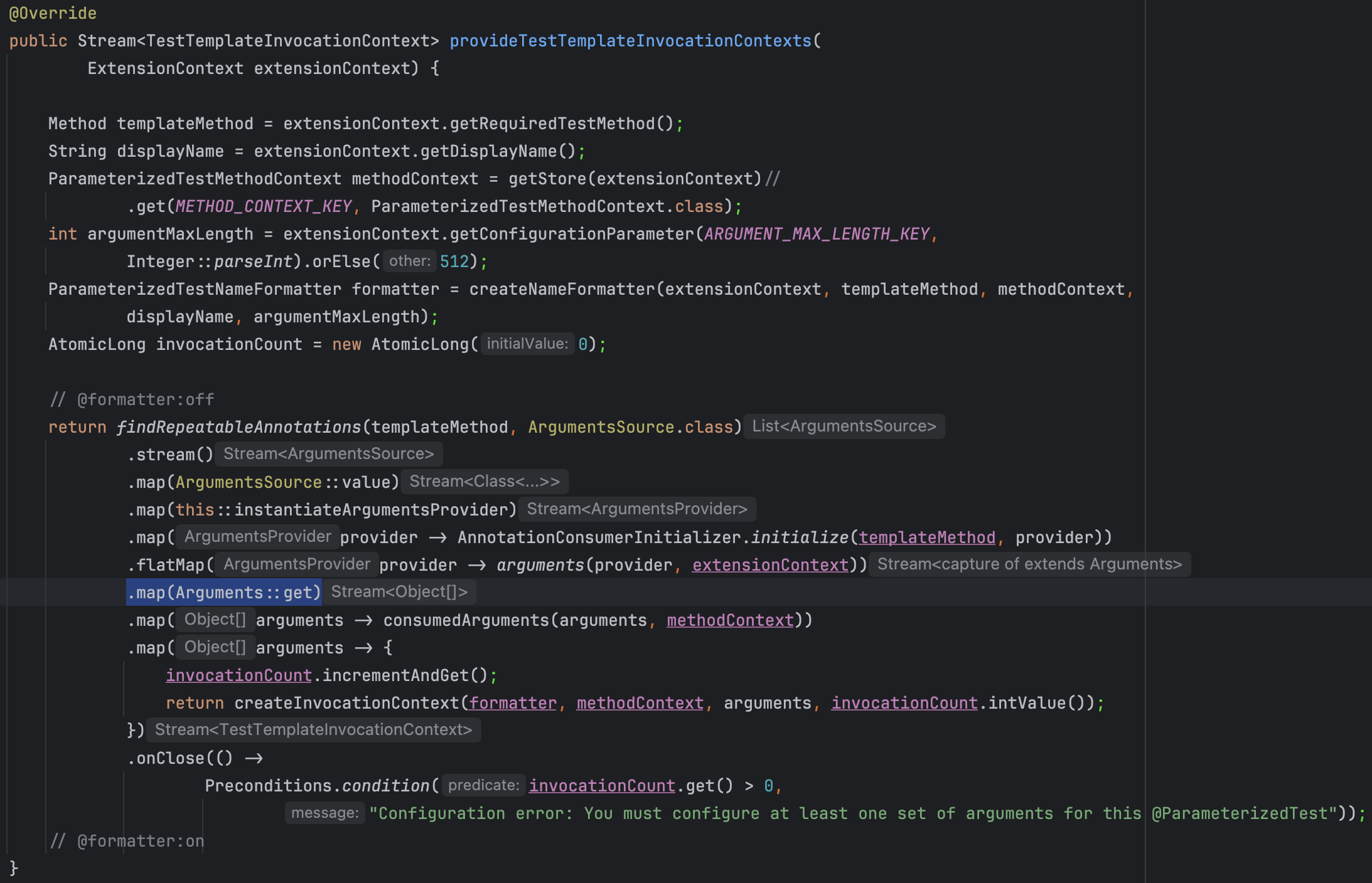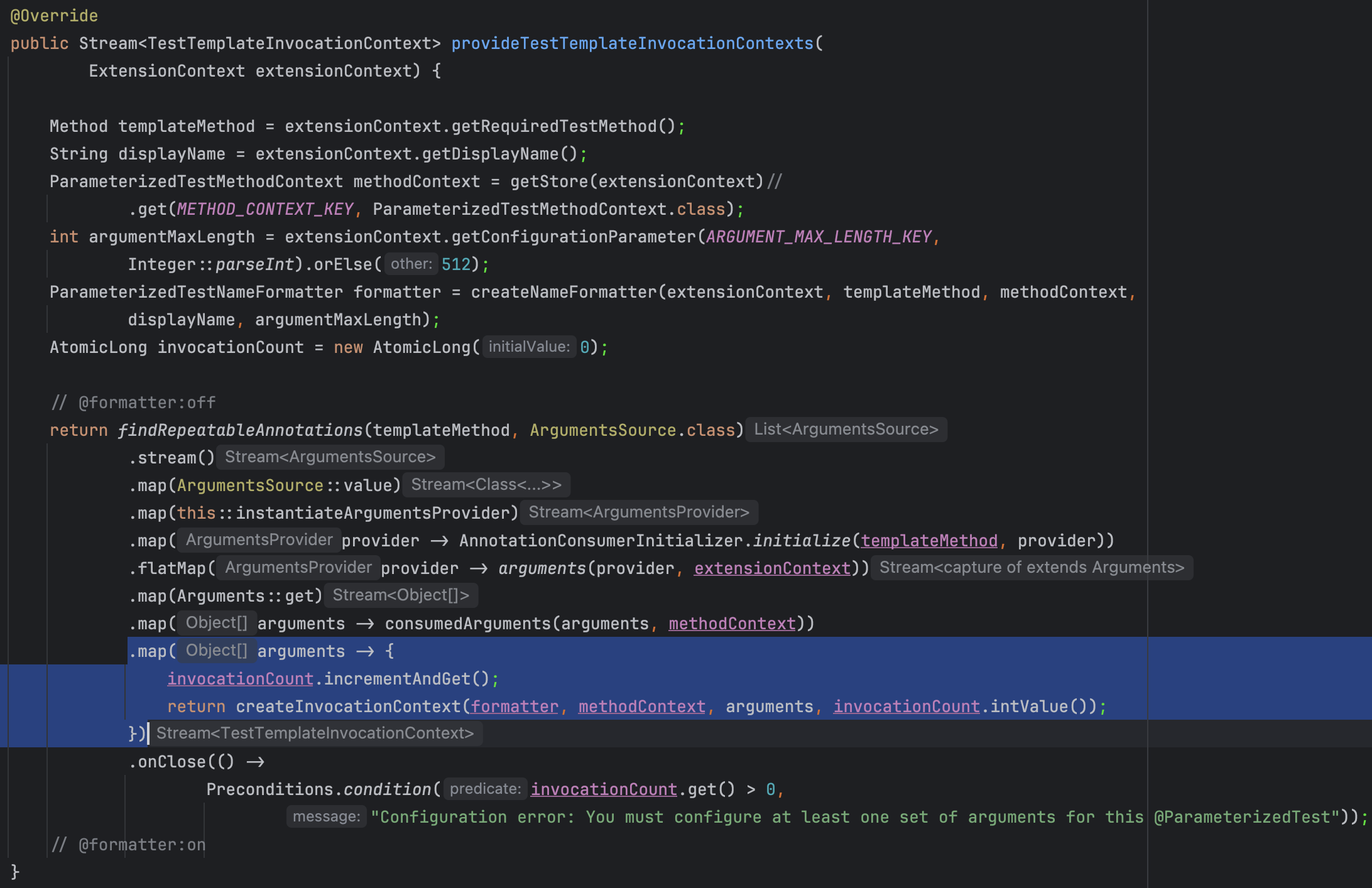 ParameterizedTestExtension 클래스의 두번째 메소드 provideTestTemplateInvocationContexts 메소드에서 그 동작 방식을 살짝이나마 엿볼 수 있었다.