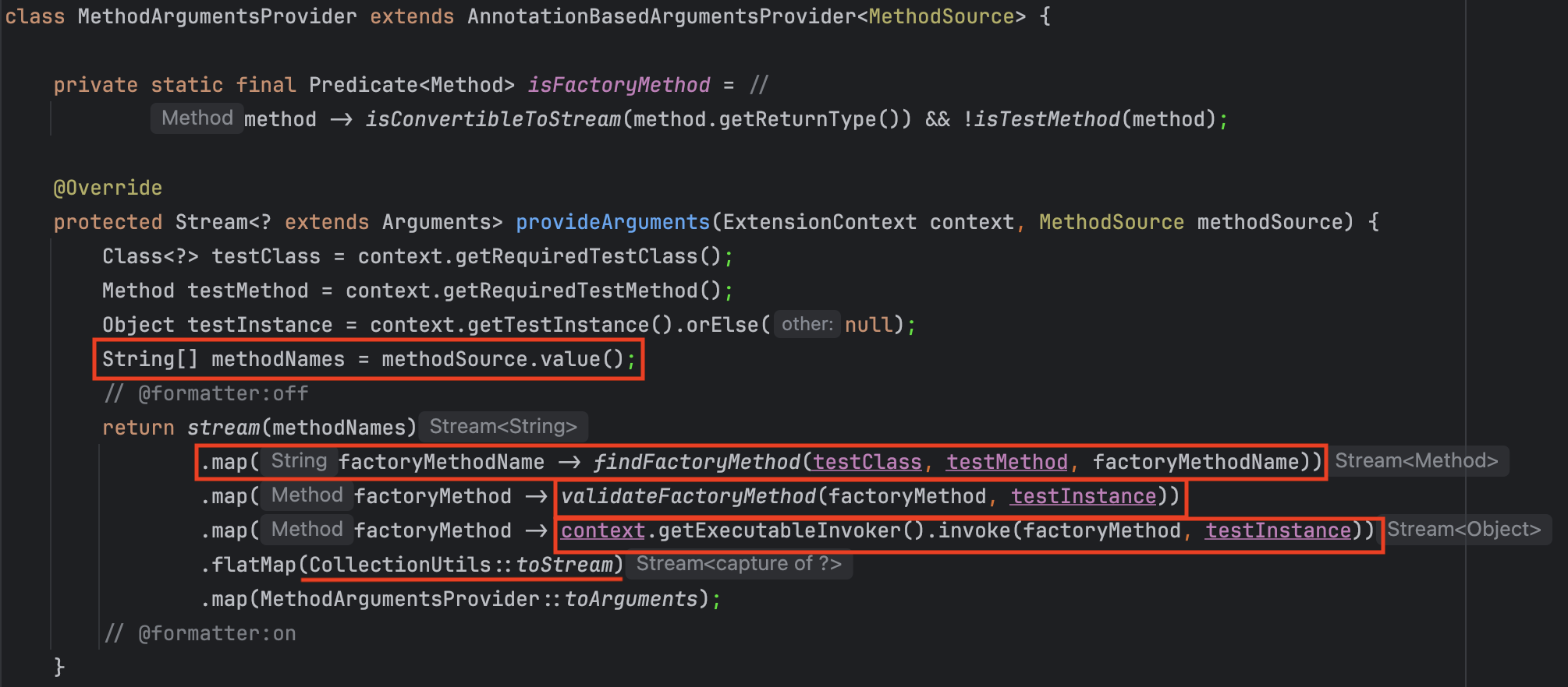 MethodArgumentsProvider 내부 메서드에서 마지막 즈음에 Stream으로 정규화 하는 과정에서 .flatMap()을 사용해 전달된 요소들을 한번 펼쳐주는 것을 확인할 수 있다.