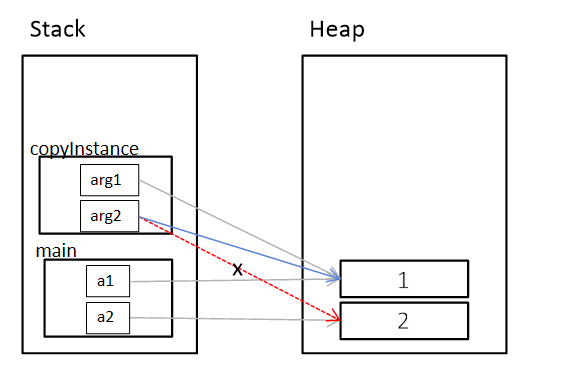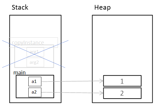 copyInstance 메소드를 통해 주소값이 복사되므로 객체 복사가 잘 이루어졌을까? 스택 영역과 힙 영역의 그림을 보면서 확인해보자.