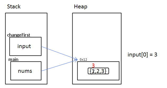 changeFirst 함수가 호출되면서 스택에 쌓이고 input 매개변수가 메인함수의 nums의 값이 전달되었다. 그러므로 nums와 input이 갖고 있는 값(주소)이 같아지므로 서로 바라보고 있는 값이 동일하다. 그러므로 input[0]의 값을 변경했을 때 nums의 실제 값도 변경되는 것을 확인 할 수 있다.