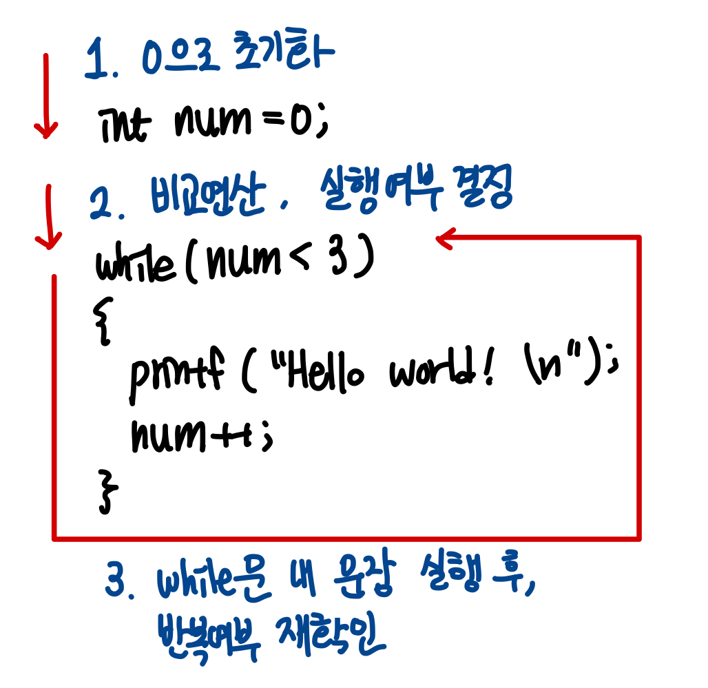 소괄호 안에는 반복의 조건을 명시하고, 이 조건이 만족되는 동안 중괄호 안에 존재하는 코드가 반복 실행되는 구조이다.
