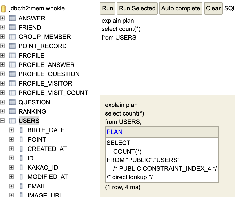 급하게 h2 에서 count 쿼리의 실행계획을 찾아보았는데, direct lookup 이라는 주석문을 보게 되었다.