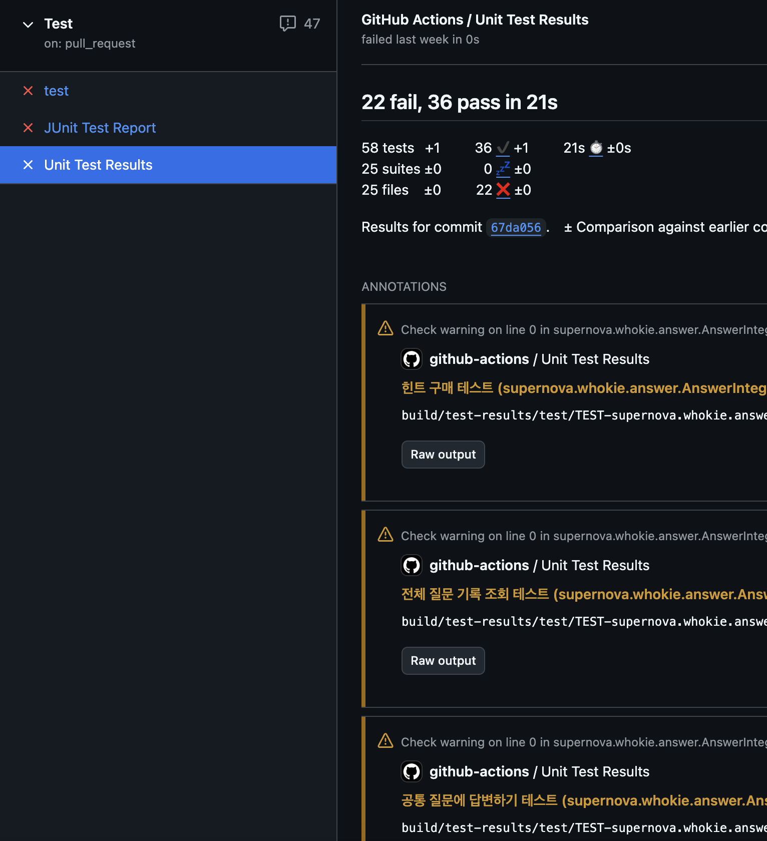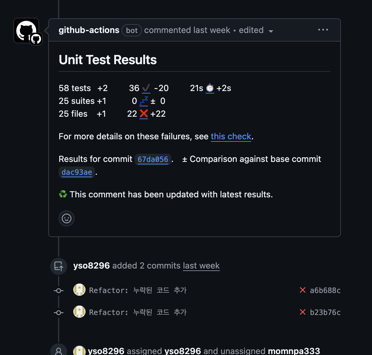 테스트가 실패할 시 실패한 코드 라인에 check 코멘트를 달아줆으로서 pr을 날릴때 바로 피드백을 받아볼수 있게 작성하였다.