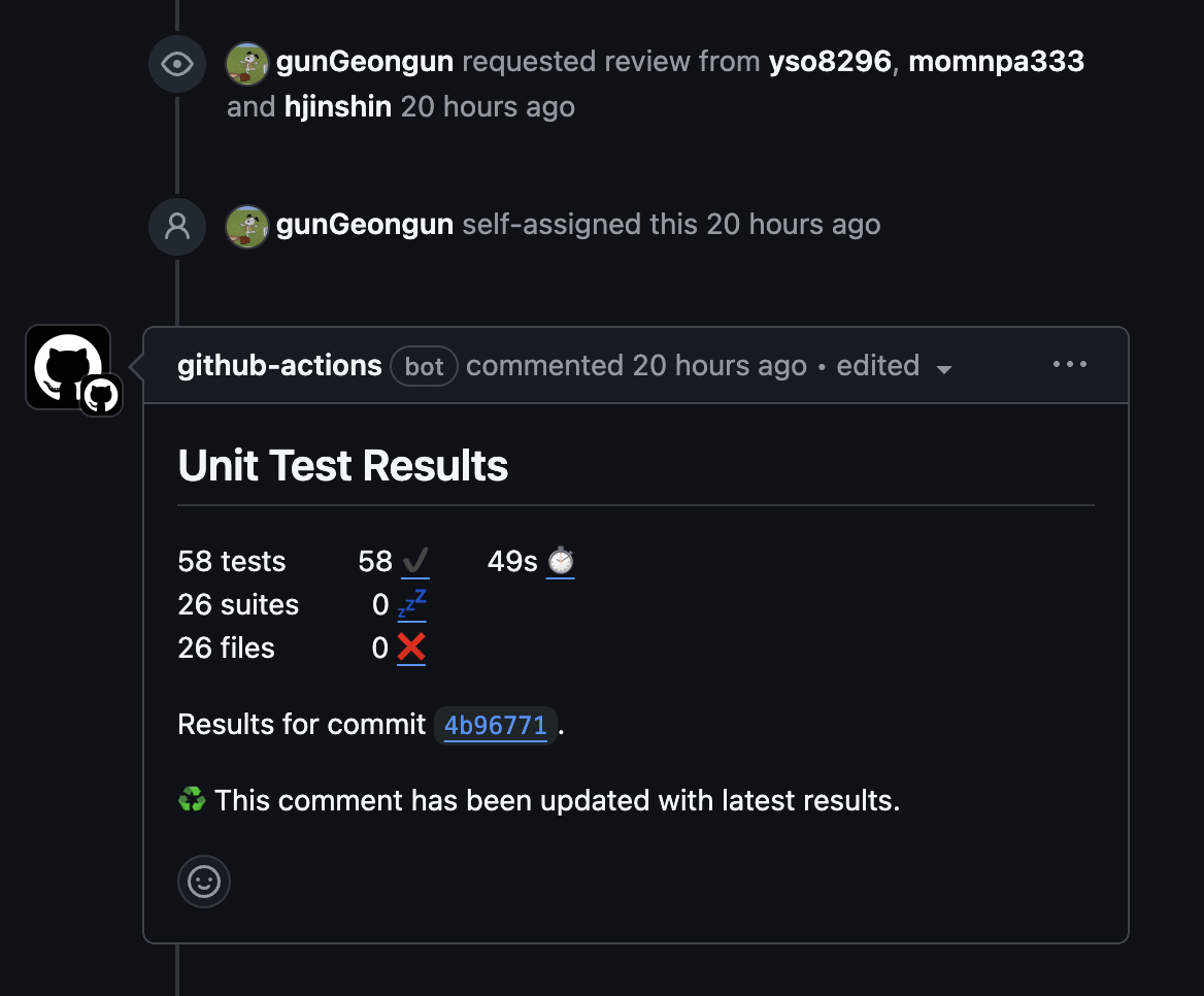 테스트 결과를 로그를 통해 일일이 확인하기 번거롭기 때문에 PR에 코멘트로 테스트 결과를 달아주어 편의성을 높였다.