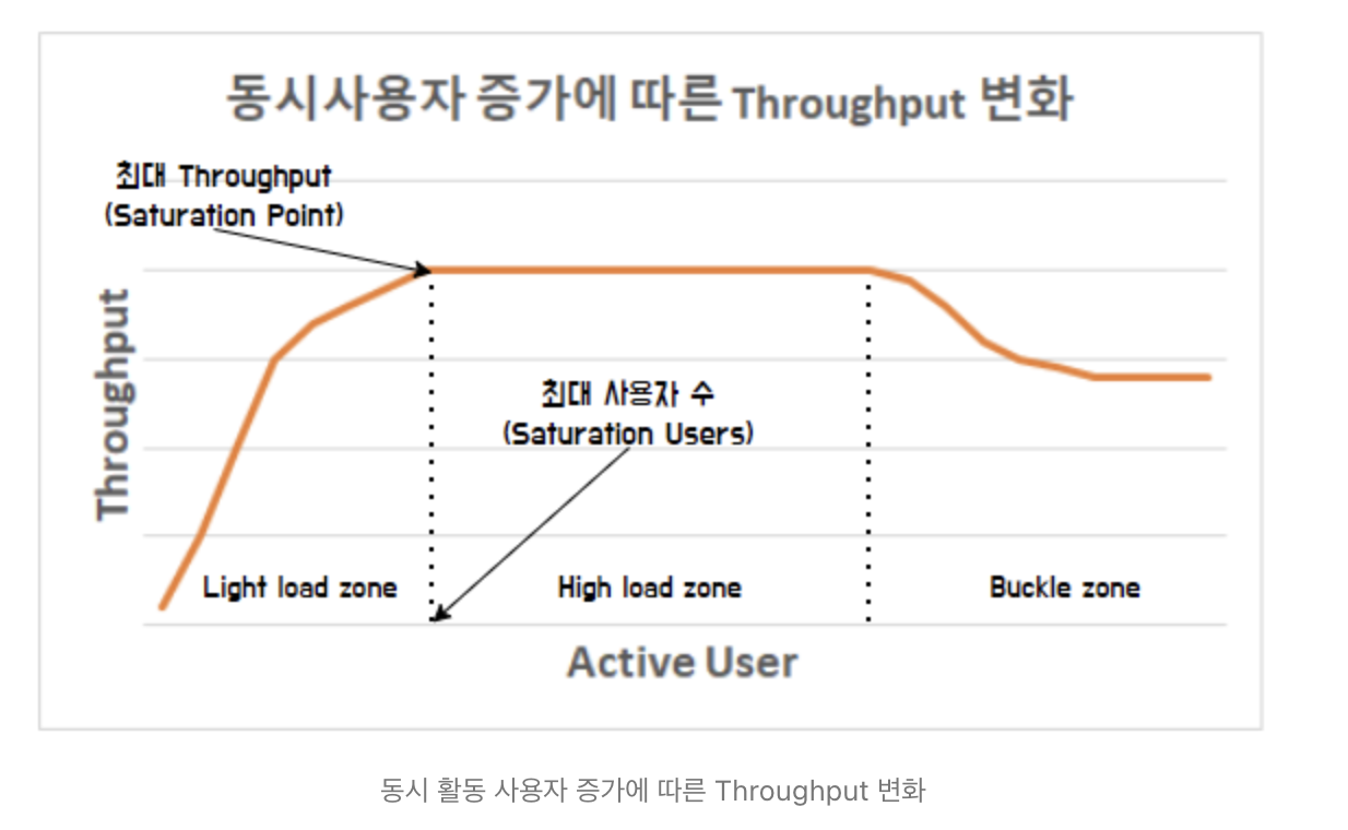 부하가 계속 증가하더라도 어느 시점에 이르러 처리량이 더이상 증가하지 않고 일정한 수준을 유지하게 되는데, 이렇게 되는 변곡점을 포화점/임계점 (Saturation point)이라 부른다. 포화점 이후부터는 대기시간 (Queuing time)이 길어지기 때문에 응답시간이 기하급수적으로 증가하게 되며, 사용자가 증가하더라도 성능이 더 이상 올라가지 않기 때문에 이 때의 동시 사용자 수를 최대 허용 동시 사용자라고 표현한다. Saturation point는 해당 시스템의 최대 처리량을 나타내는 지점이 된다.