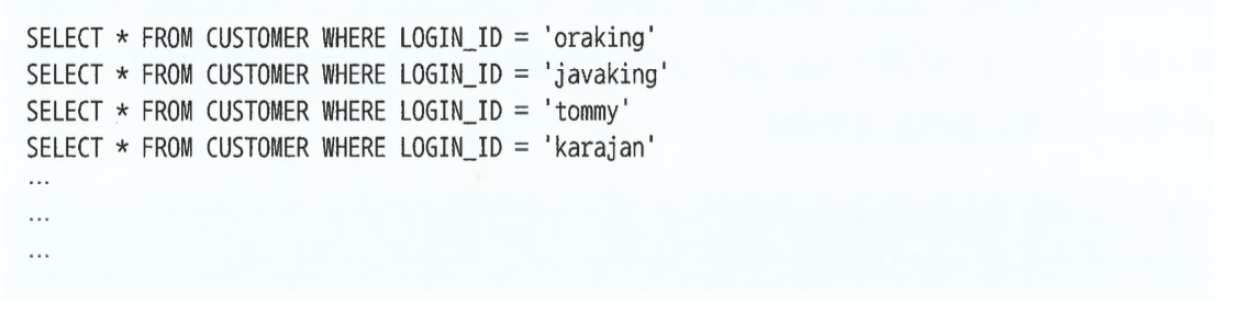 DBMS에 발생하는 부하는 대개 과도한 I/O가 원인인데, 오히려 I/O가 발생하지 않고 CPU 사용률이 올라가는 일이 초래할 것이다. 아마 라이브러리 캐시를 보면 아래와 같은 sql이 가득 있을 것이다.