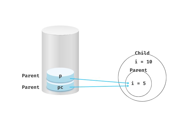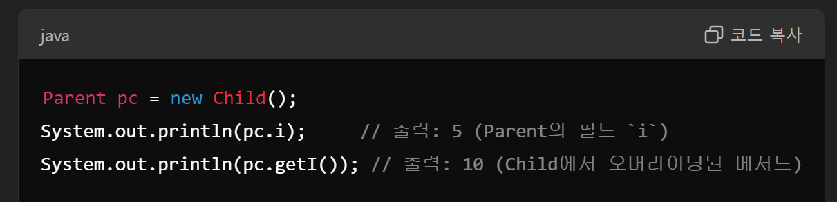 pc는 Child 객체를 참조하고 있지만, Parent 타입으로 선언되었기 때문에 필드i에 접근할 때는 항상 Parent 클래스의i = 5를 사용한다.