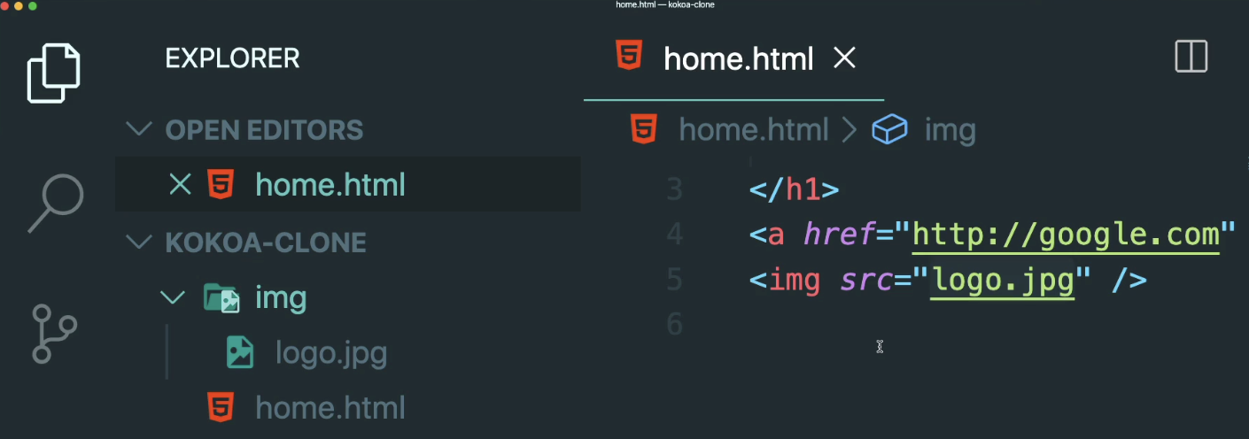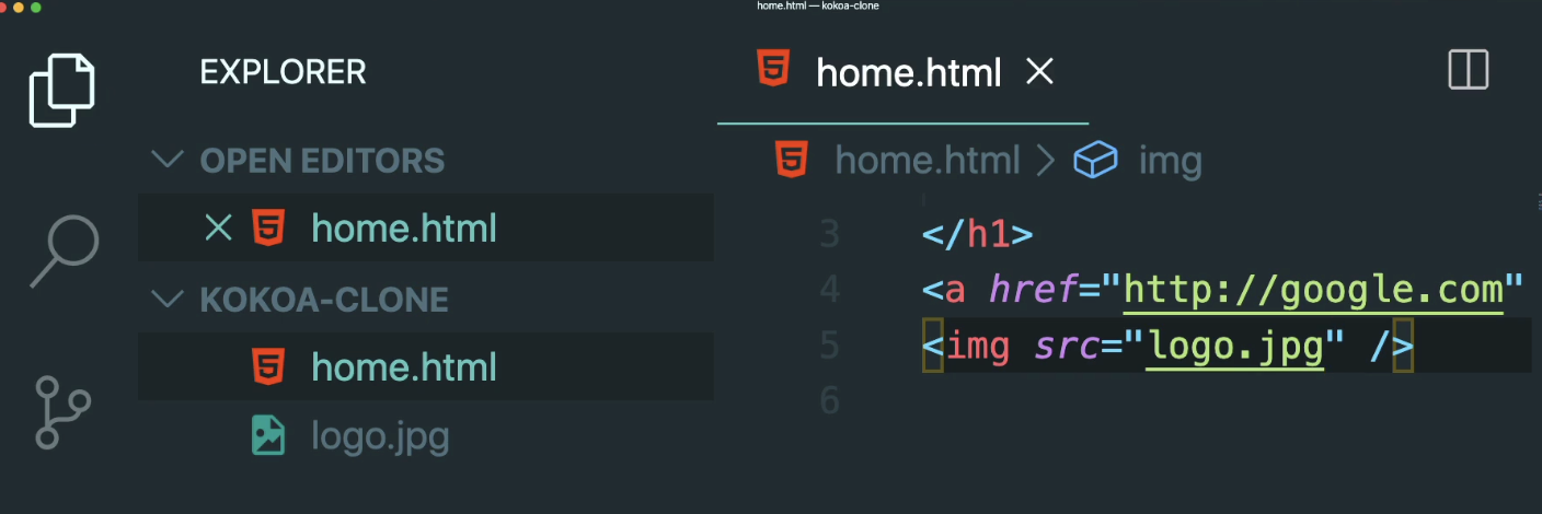 In this case, our logo.jpg file is next to or at the same folder as home.html. This is very important, because <img src="logo.jpg"/> means that logo.jpg is in the same folder as home.html. If logo.jpg were in a different folder, just like the picture below,
