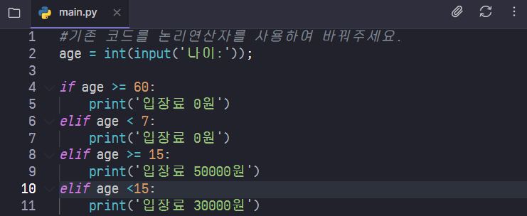 🔎나이에 따라 입장료가 달라지는 조건문을 논리 연산자를 사용하여 간결하게 바꿔봅시다.
