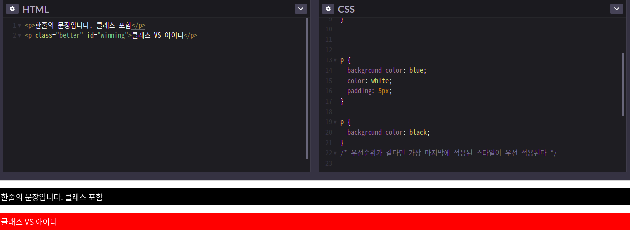 동일한 우선 순위를 갖는 두 규칙이 적용될 때 CSS에서 마지막에 나오는 스타일이 우선적용된다