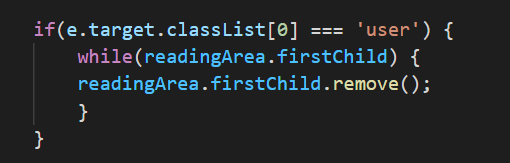 부모 엘리먼트(readingArea) 안에 firstChild의 값이 있을 시, firstChild 값을 제거해주는 반복문을 돌려주었다. 마지막 남아있는 firstChild 값을 제거 후 반복문을 빠져나와 부모 엘리먼트는 그대로 살릴 수 있었다.
