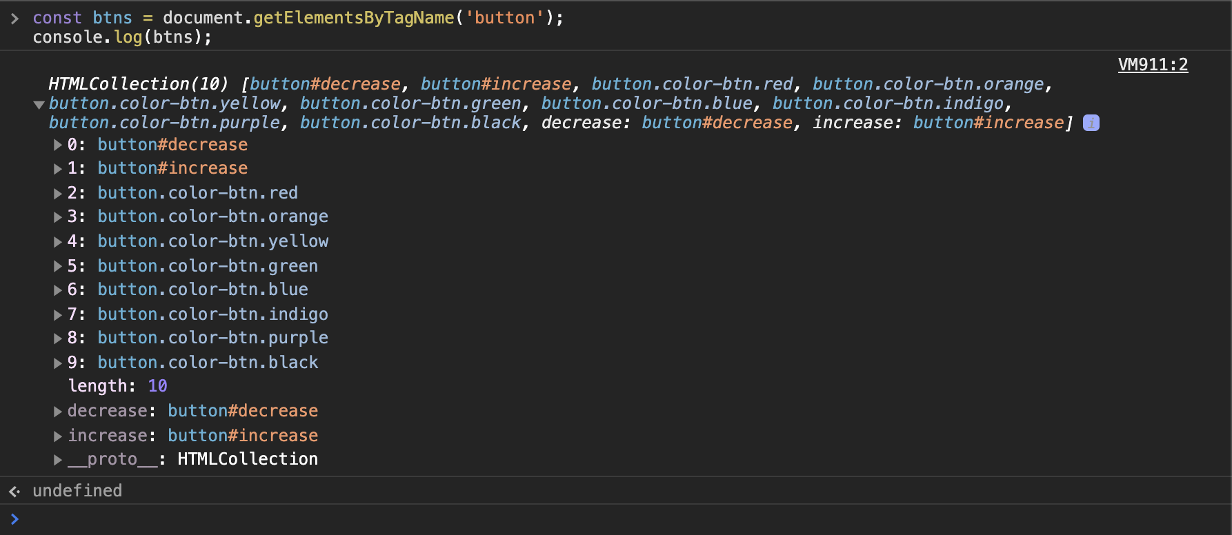 결과는 다음과 같이, 문서 내에 있는 모든 button 태그가 포함된 HTMLCollection 형태로 반환된다.