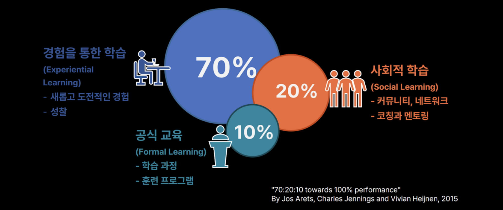 소프트 스킬을 어떻게 배워야 할지에 대한 해답으로 70-20-10의 법칙을 제시해주었다: