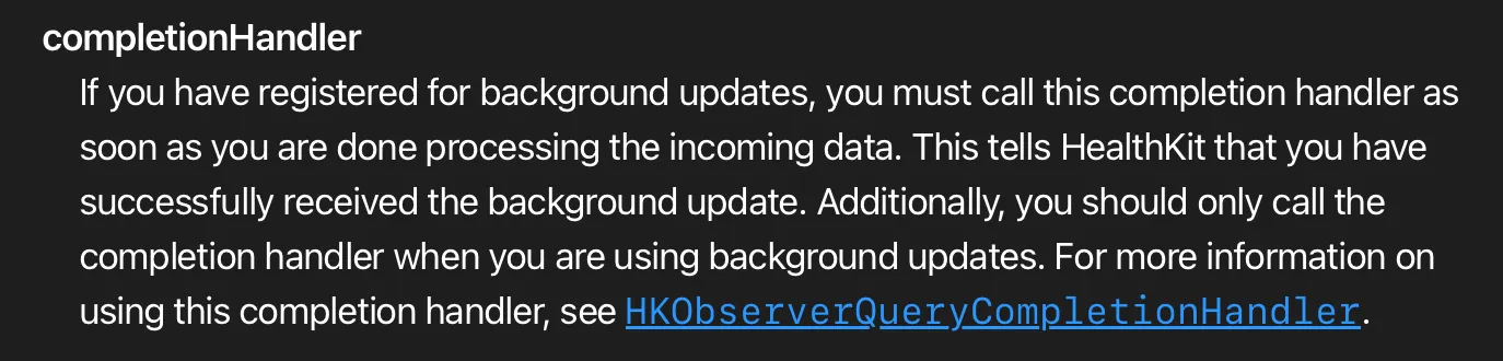 해당 메소드를 실행하게 되면 시스템이 저희 앱을 기억하고 있다가 지정한 특정 타입의 데이터(HKObjectType)에 변경(저장 or 삭제)이 일어나면 앱을 깨워줍니다.