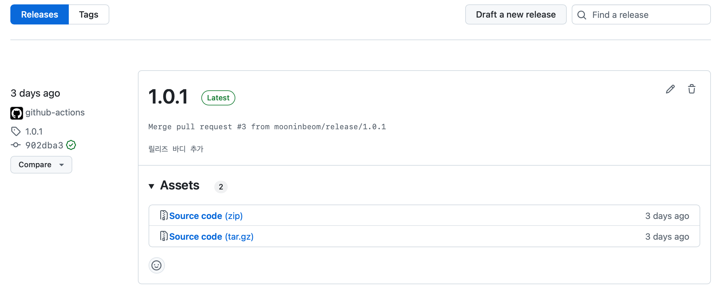 이를 위해서 pr 브랜치를 올릴 때 브랜치 명을 release/1.0.1, release/3.4.2 이런 식으로 release 하고자 하는 버전 명을 명시하여 생성합니다.
