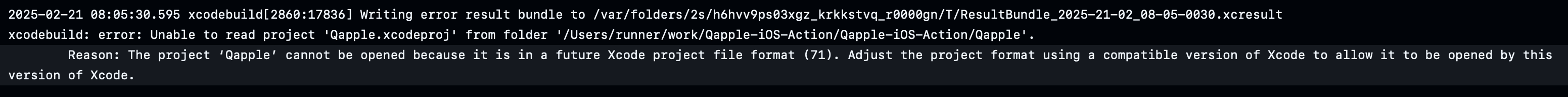 대충 Actions에 실행되는 Xcode와 프로젝트의 Xcode 버전이 맞지 않다는 얘기인 듯 합니다.