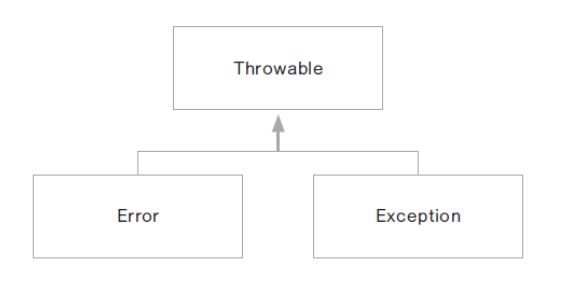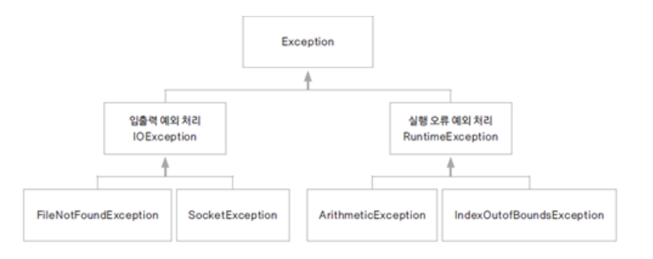 - 예외 (Exception): 프로그램에서 제어 할 수 있는 오류, 읽으려는 파일이 없는 경우, 네트웍이나 소켓 연결 오류 등