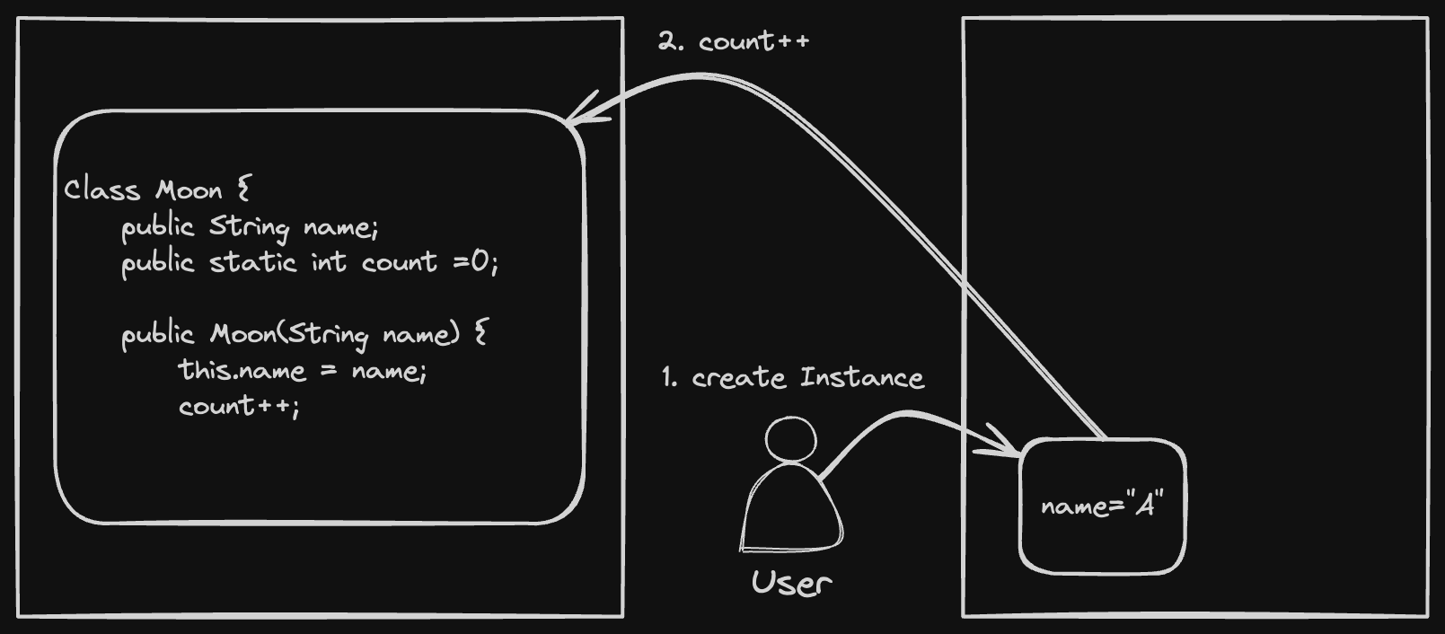 Moon 이라는 클래스는 사용자가 인스턴스를 생성할 때 count 가 증가되는 생성자를 가지고 있는 코드이다. count 자체가 static 으로 선언 되었기 때문에 인스턴스 변수와 달리 메서드 영역의 클래스 안에서 값이 바뀌므로 이 후에 새로운 인스턴스를 생성해서 static 변수의 값에 변화를 주어도 전에 추가됐던 값에서 변경될 수 있다.