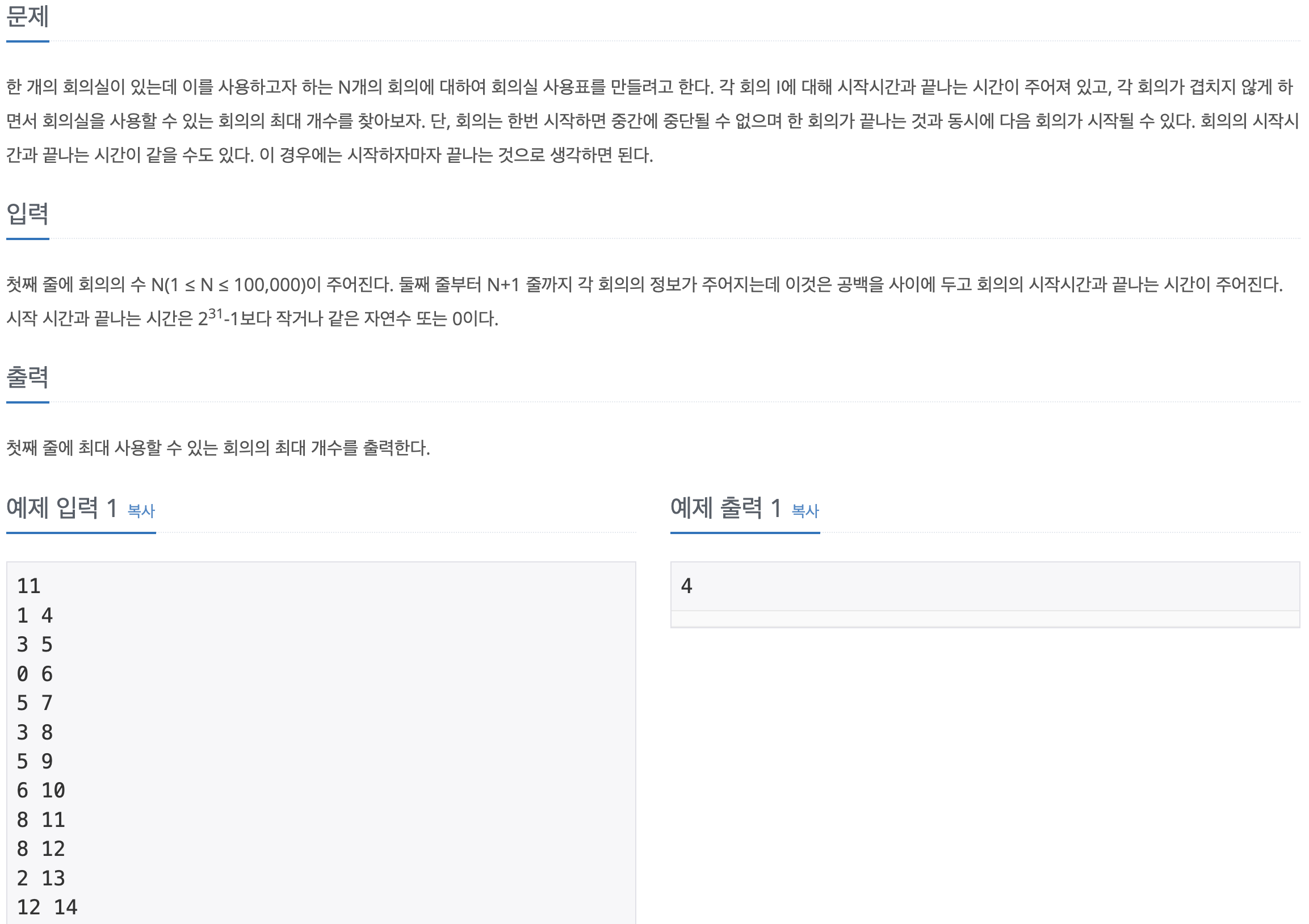 - 여러 개(N 개) 의 회의 시간(시작 시간, 끝 시간)에 대한 정보를 준다.