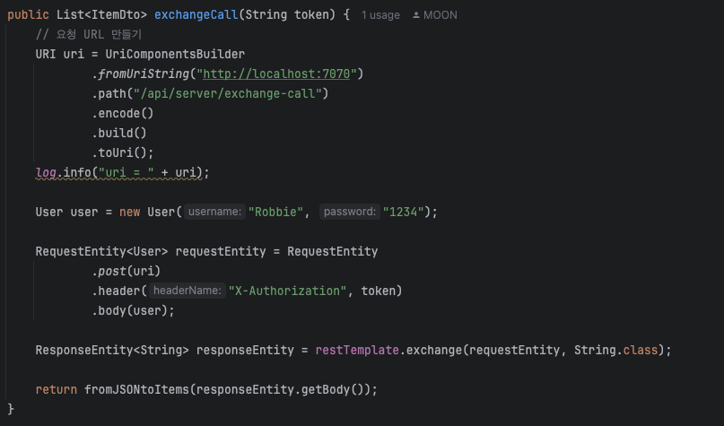 자 일단, Uri 를 생성해서 해당 Uri 와 서버로 보내서 받고자 하는 자료형을 적어 getForEntity 로 보내면 7070 포트의 Uri 에 Get 메서드가 전송된다.