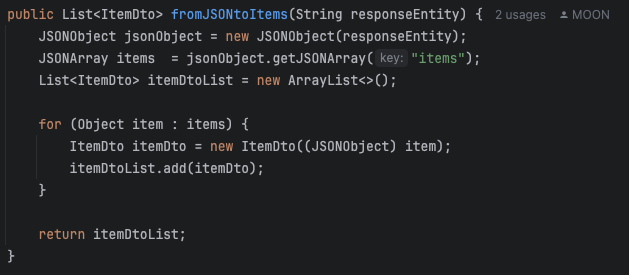 따라서 해당 라이브러리를 통해 키 값으로 새로운 JSONArray 라는 리스트에 담을 수 있게 만들어져 있고,
