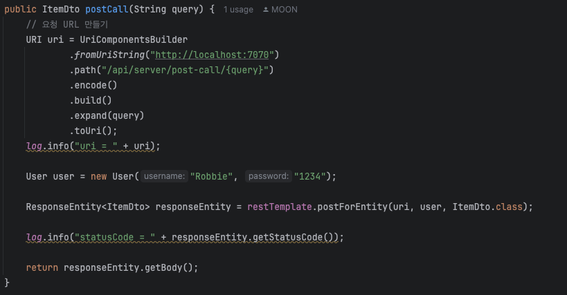 Get 방식과 비슷하지만 다른 점은 postForEntity 메서드를 통해 보내야 한다.