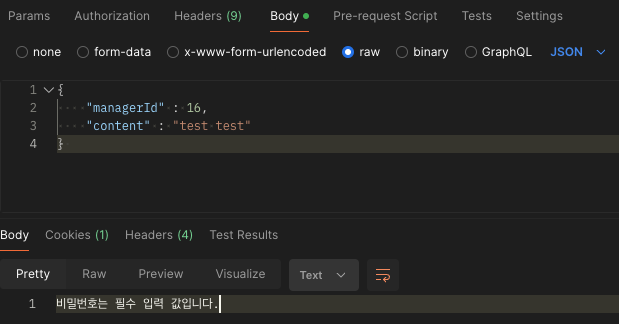 그러면 앞에서 설정했듯이 password 값이 기입되지 않으면 message 에서 작성한 멘트가 출력된다.