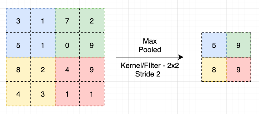 가장 중요한 정보를 추출하기 위해 사용되는 방식으로 Max Pooling의 경우 해당 영역에서 가장 큰 값을 가져와 결과 데이터에 추가하는 방식이다.