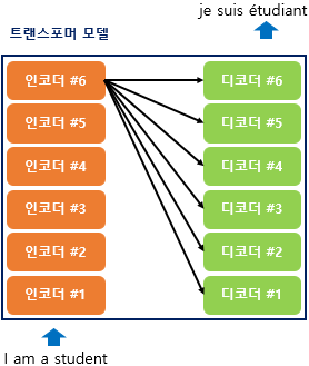 첫번째 그림인 셀프 어텐션은 인코더에서 이루어지지만, 두번째 그림인 셀프 어텐션과 세번째 그림인 인코더-디코더 어텐션은 디코더에서 이루어집니다.